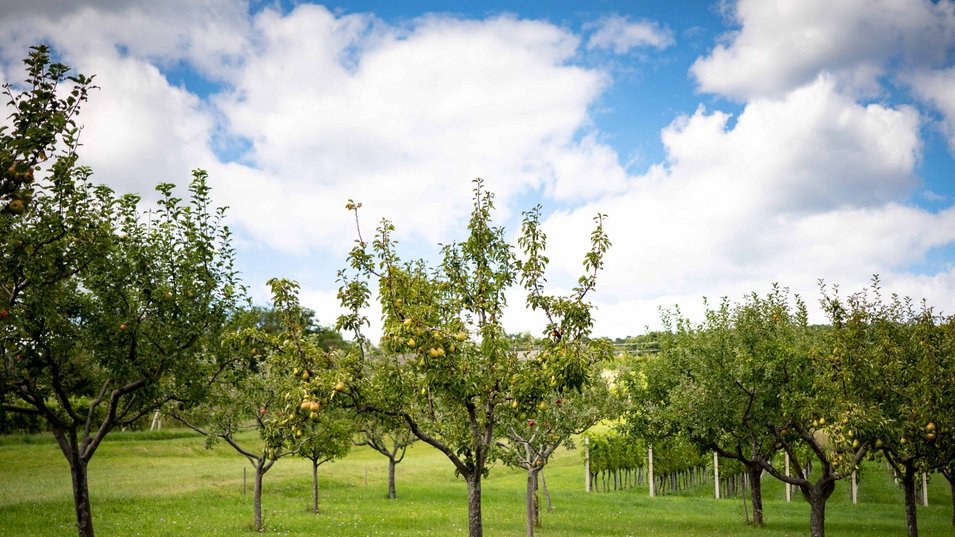 For around 40 kilometres, this circular route winds gently through the gentle hilly landscape, past old farmhouses, fragrant orchards, charming cellar districts and venerable orchards that are rarely found today.