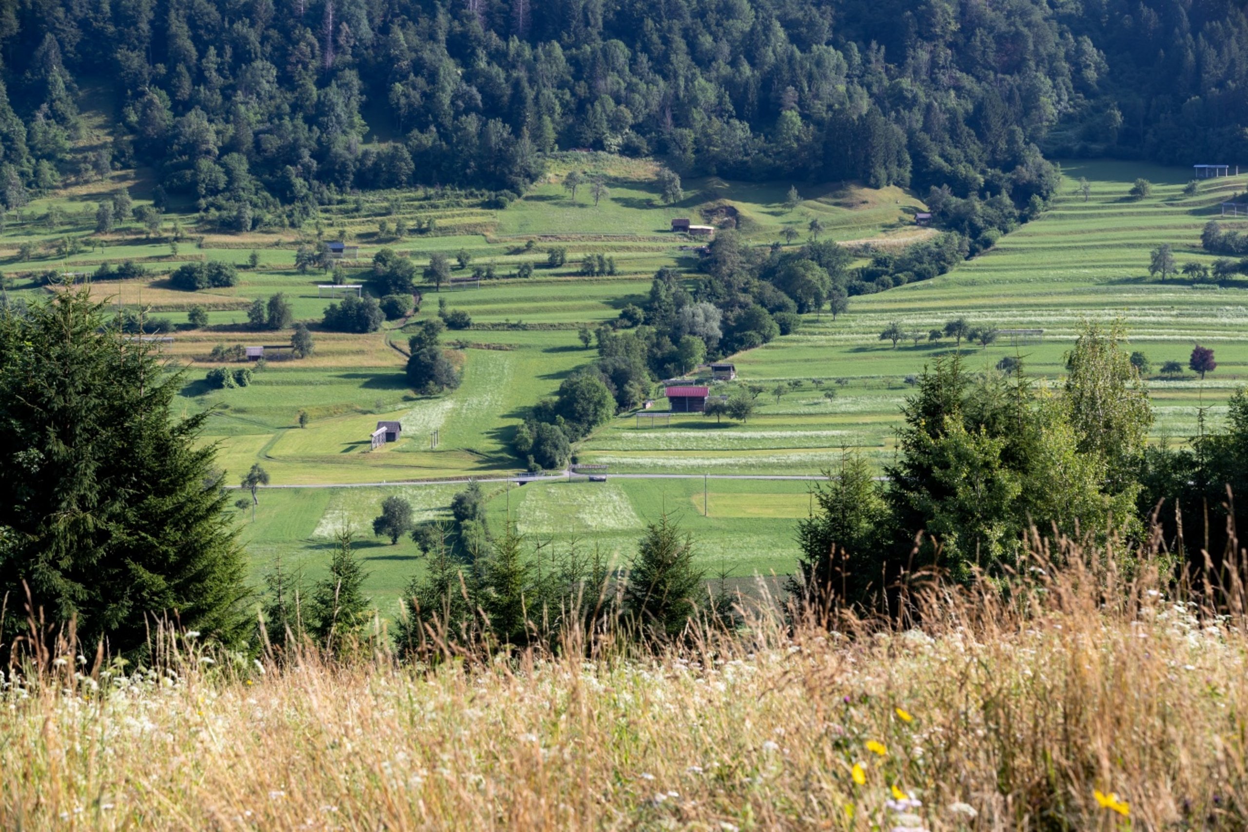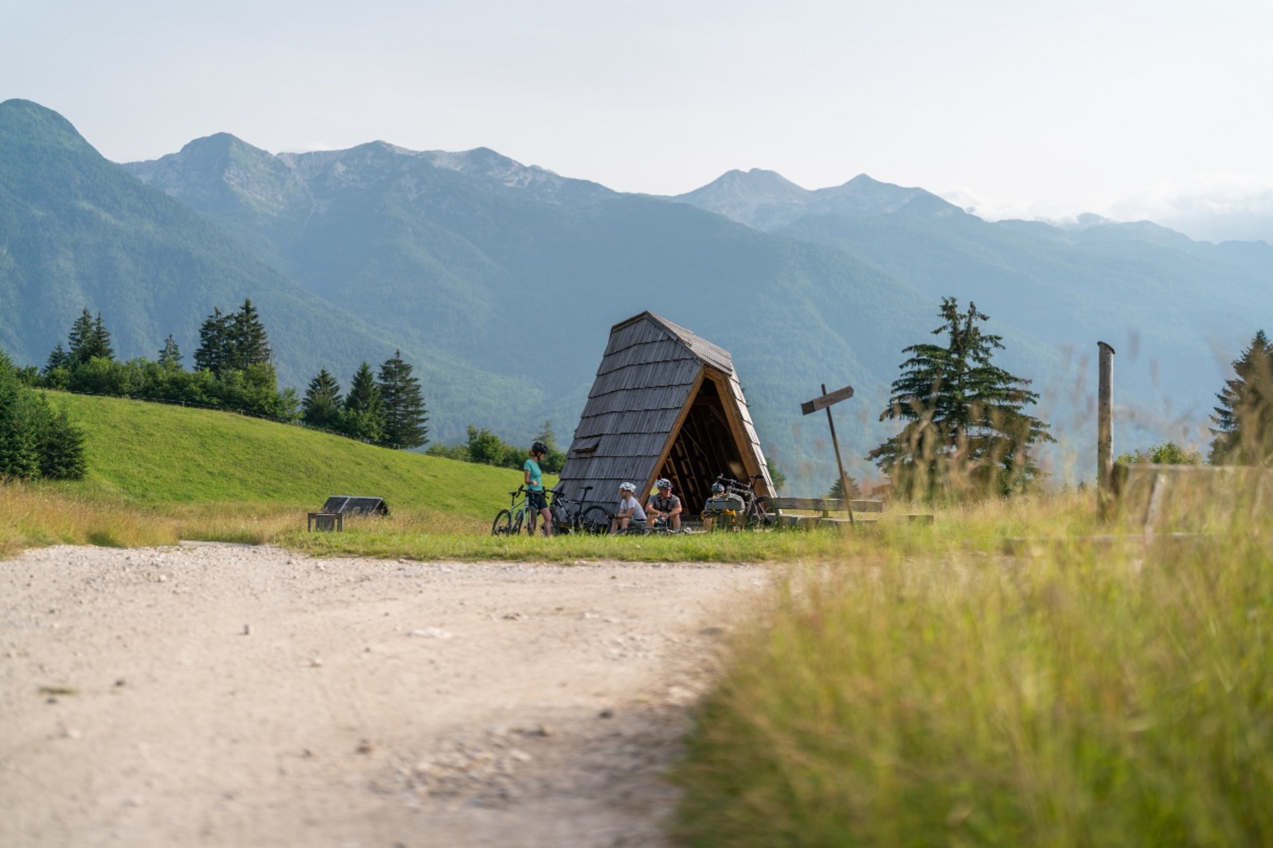 From the car park at the Danica campsite, a sign leads us along the cycle path past the football pitch and Danica campsite over a wooden bridge over the Sava Bohinjka. After a few hundred metres, turn left and continue along the asphalt road across beautiful meadows to the village of Brod. In the village, join the main road and follow the cycle path markings to the bridge (on the left) in the village of Savica. There we leave the main road and turn right back onto the cycle path. We cycle along the left bank of the river and enjoy the marvellous views of the Bohinj-Tolmin mountains. Shortly before entering the Upper Bohinj Valley, a short but steep climb awaits, where you have to watch out for oncoming cyclists. When you reach the village of Stara Fužina, turn right before the bridge over the Mostnica River and continue along the left bank of the Mostnica until it flows into the Ribnica. At the edge of the village (before the bridge over the Ribnica), turn right and follow the road until you cross the main road at Studor. We cross the main road and turn right into the village at the first houses. We follow the cycle path markings and turn right at the chapel, then soon left past the Mrcina ranch (on the right). After a short descent, we cross the main road again and cycle across meadows in the direction of the Senožet ski resort (note: at the chapel in the middle of the meadows, we follow the tarmac road). The ski resort is on your right and you follow the tarmac cycle path until you reach the village of Češnjica. There, signposts point you to the right and a steep climb to the top of Senožet follows.