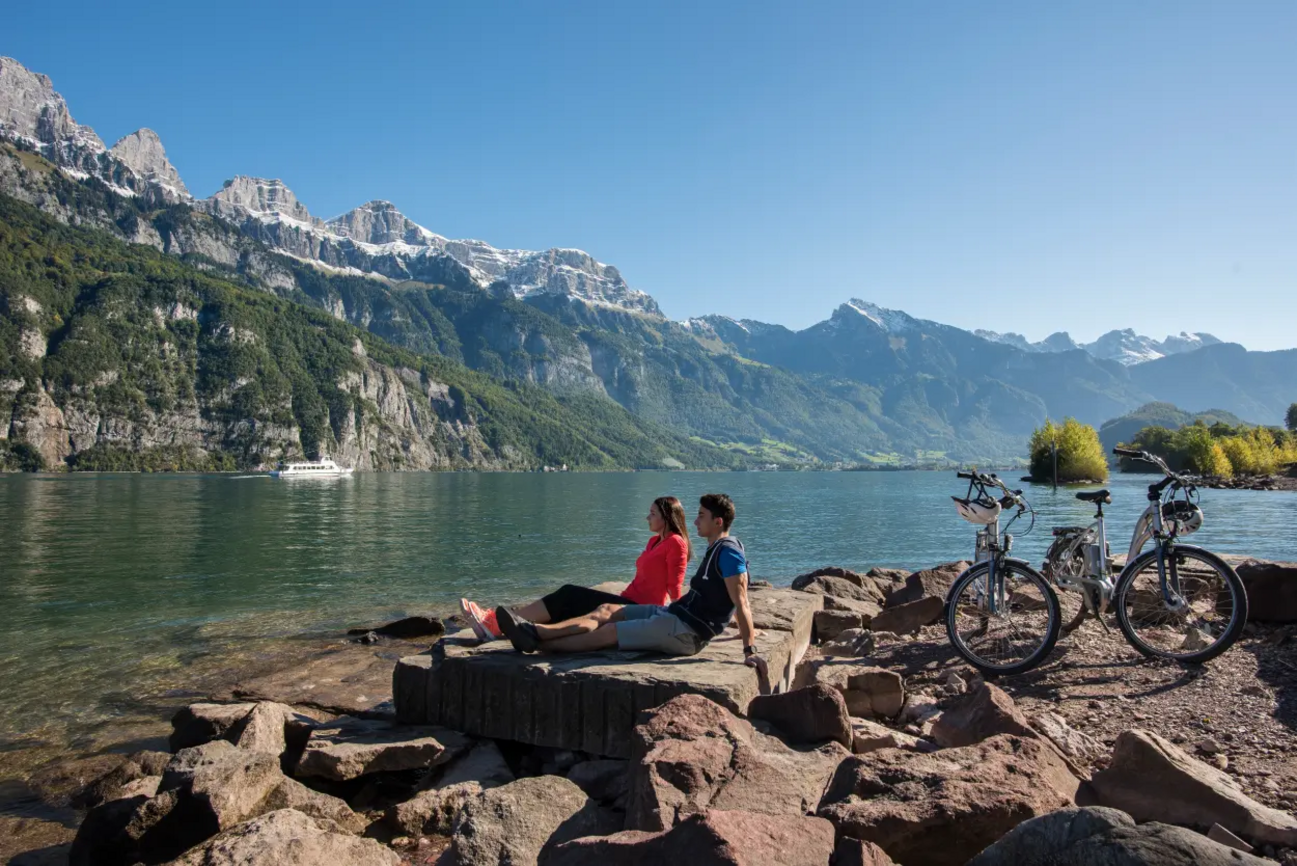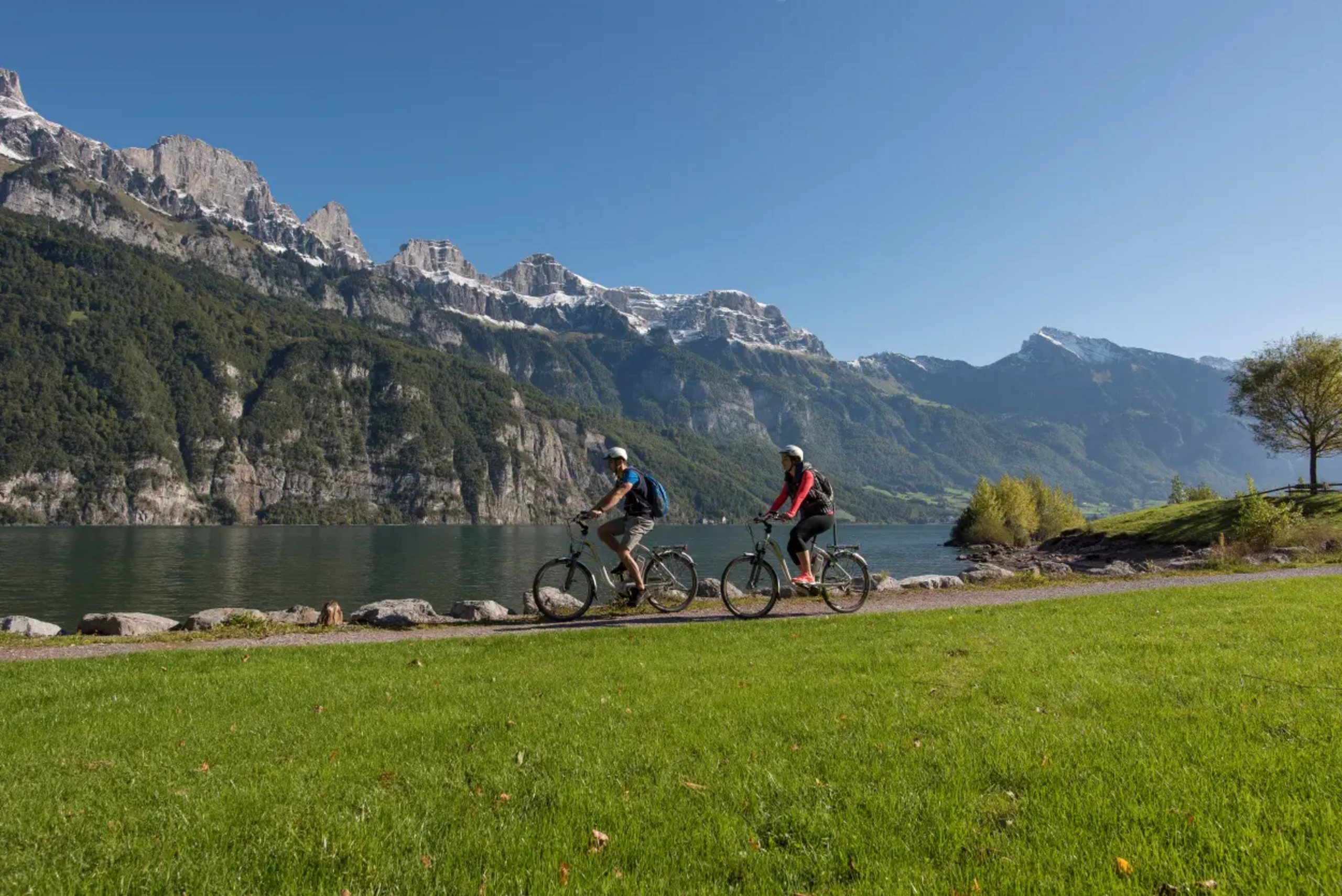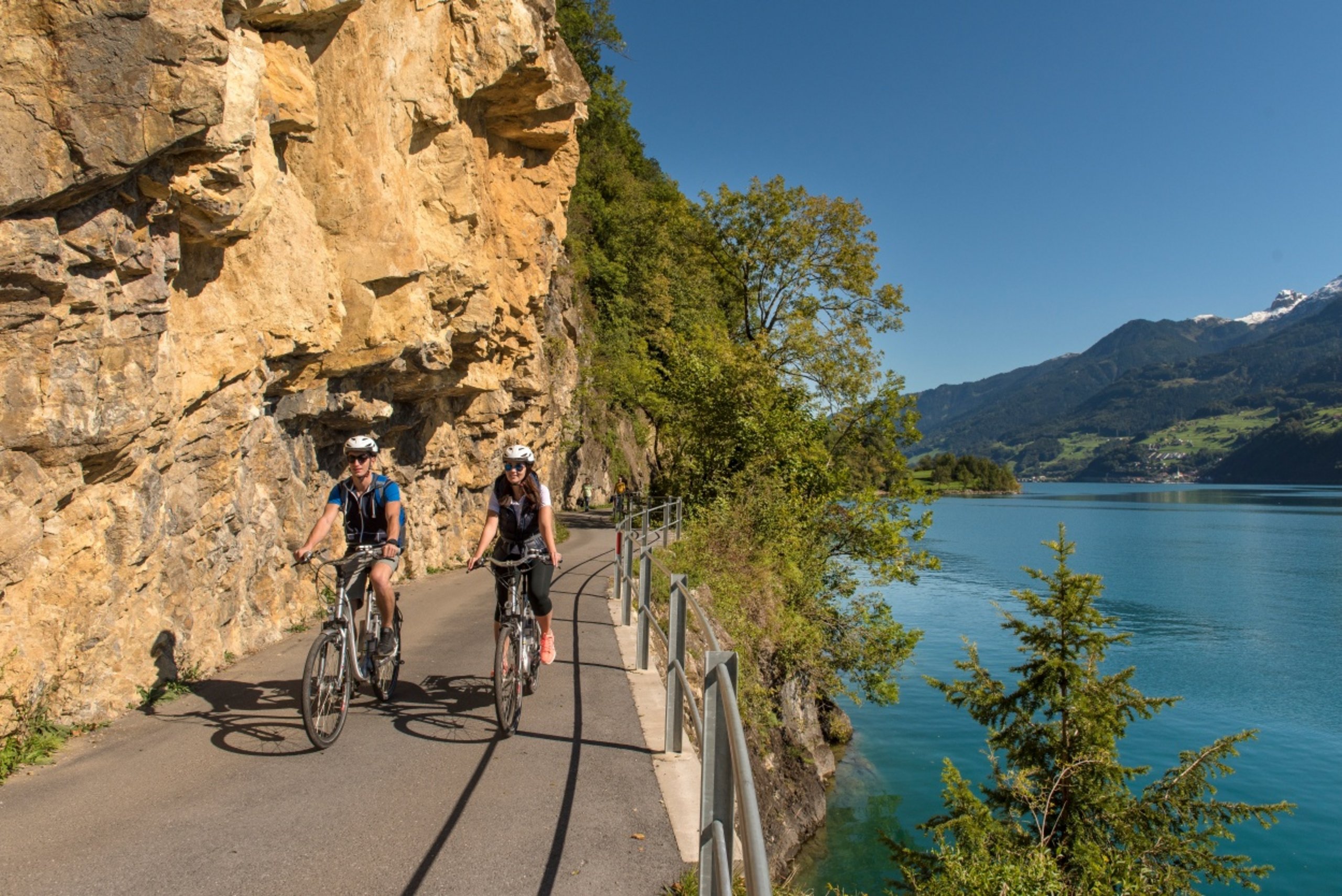 The tour starts at the Intersport Network in Unterterzen. There you will receive an expert introduction from the employees of the Intersport Network sports shop. Whether you prefer a leisurely ride on an e-bike or a more sporty ride on a non-motorised bike, the tour takes you along the Strandweg to Mühlehorn for a starter. At the Seerestaurant zur Brauerei, you have a choice of three fresh dishes. After refreshments, the route continues along Lake Walen. The tour leads through cool forests and tunnels to Weesen. Once there, the main course awaits you at the Flyhof restaurant. Afterwards, it's ship ahoy! Enjoy an approx. 1-hour boat trip. Alternatively, if you still have some time, it's worth taking a trip to the impressive Seerenbach Falls and then travelling from Betlis to the harbour. Once you arrive in Unterterzen, the bikes are handed in and a sweet finale awaits you at the Marina Walensee restaurant.