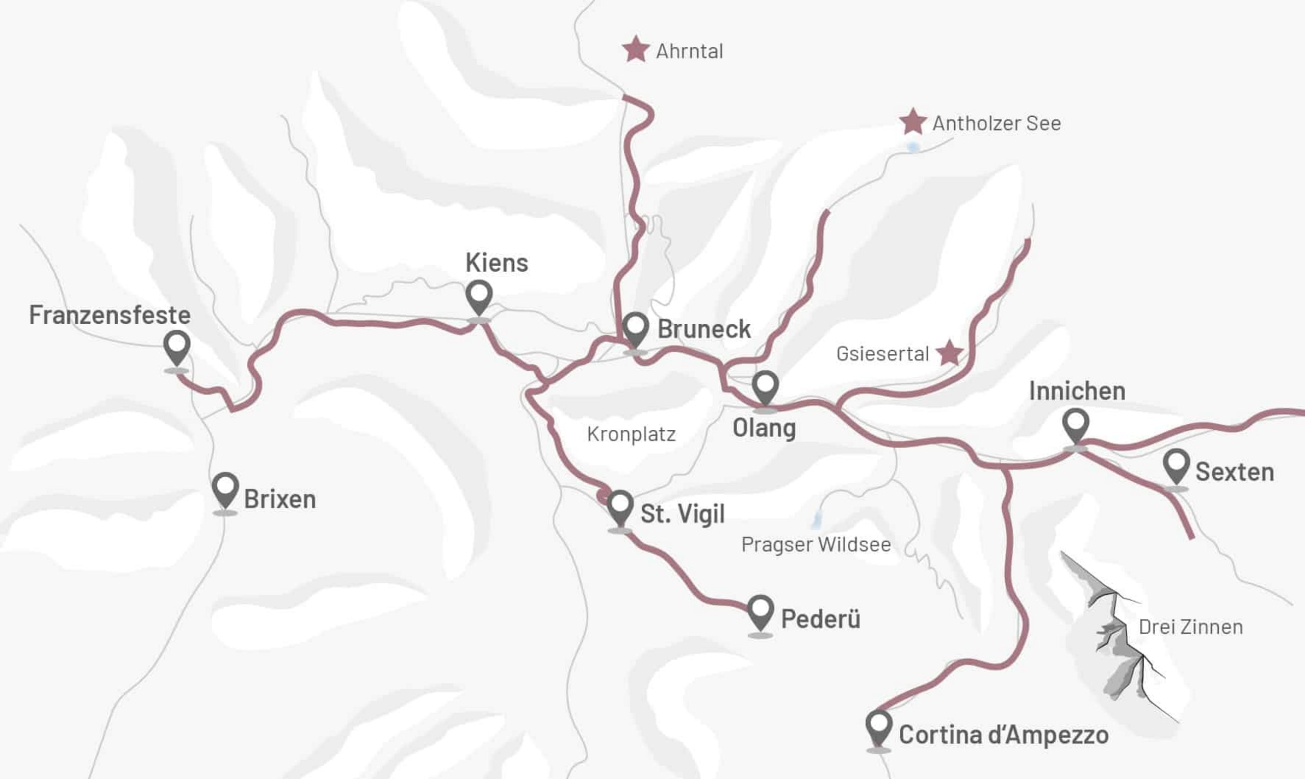 Highlights along the way? The Capriz cheese dairy, the South Tyrolean Museum of Folklore, Lake Braies, Lake Anterselva, the cheese bunker, Taufers Castle and the Reinbach waterfalls. The tour can be completed in one go or in stages.