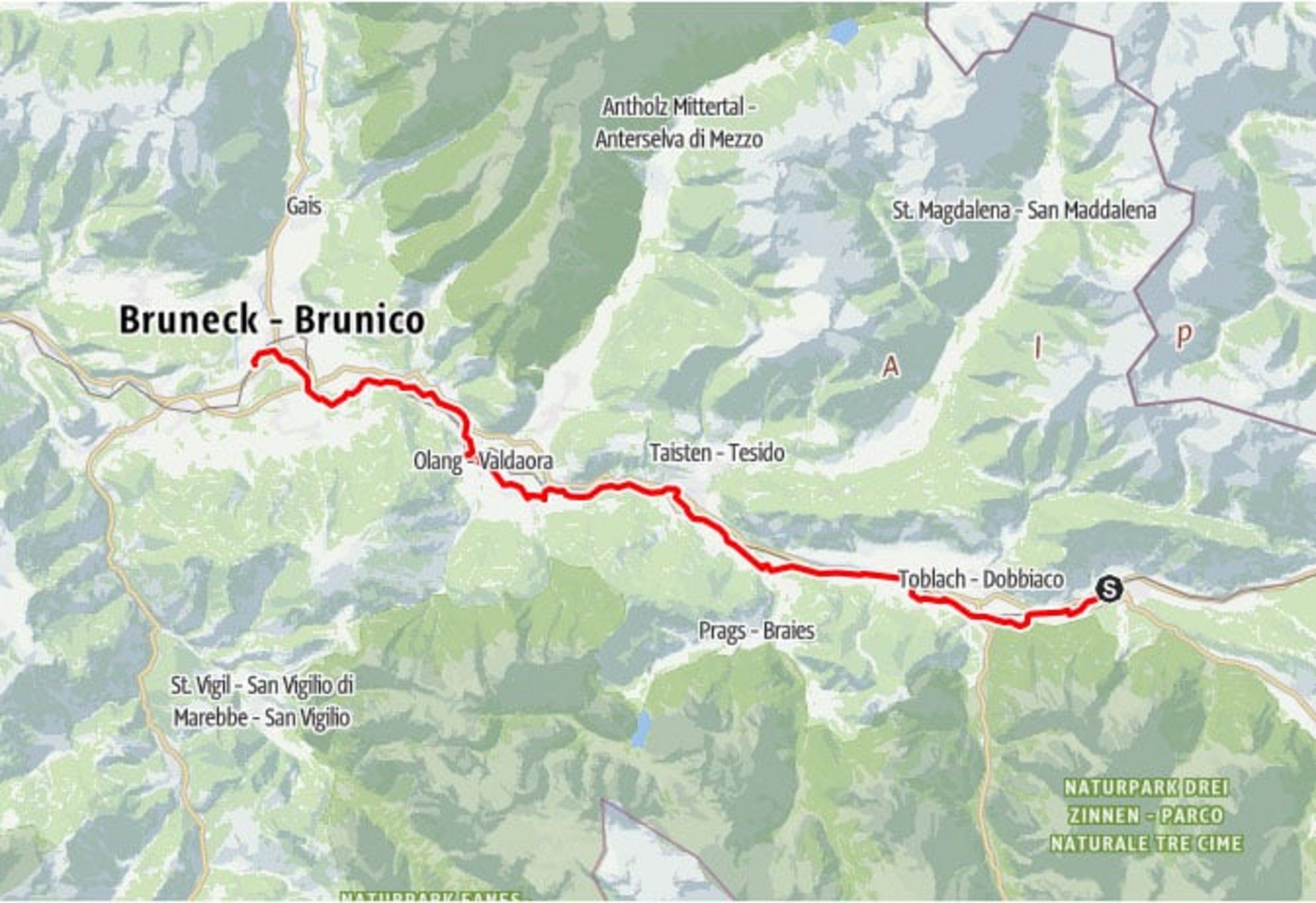 The tour starts in San Candido and first leads to Dobbiaco, the highest point of the stage. It then heads downhill along the Rienz river via Niederdorf to Welsberg. There you can make a stop at the golf course or at Welsperg Castle. Continue to Olang, where you pass the districts of Oberolang, Mitterolang and Niederolang. Highlights include the Olang children's world, the 3D archery course and the restored Venetian "Lipper Säge".