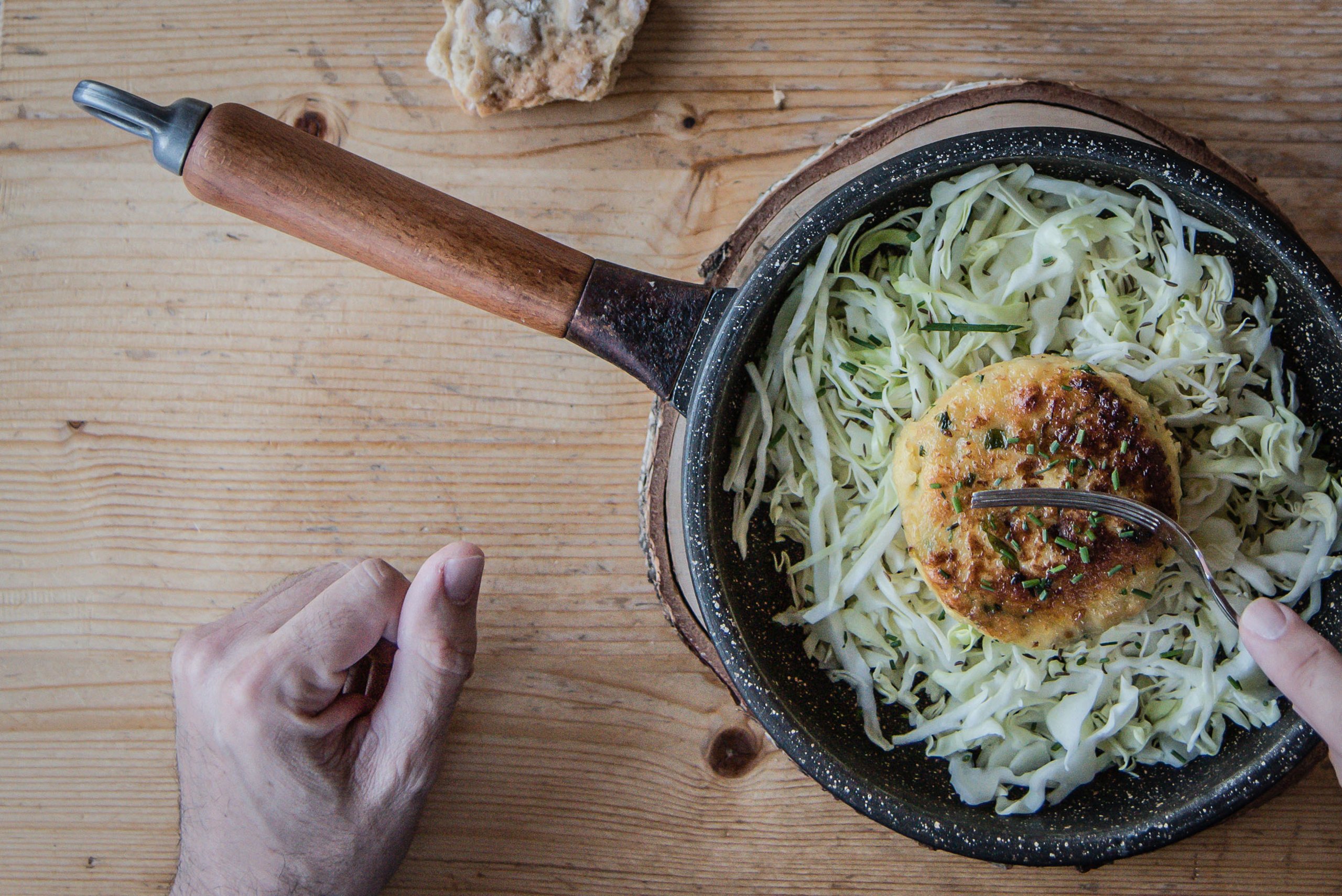 Cut the grey cheese into small cubes and mix with the dumpling bread. Whisk the eggs with the milk and add to the dumpling bread with the flour, buckwheat flour and parsley. Season with salt and pepper. Knead all the ingredients well and leave to rest for 15 minutes. Shape the dumplings, flatten slightly and fry slowly in a pan with butter on both sides until golden brown.